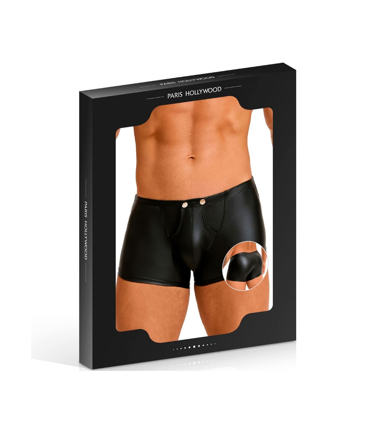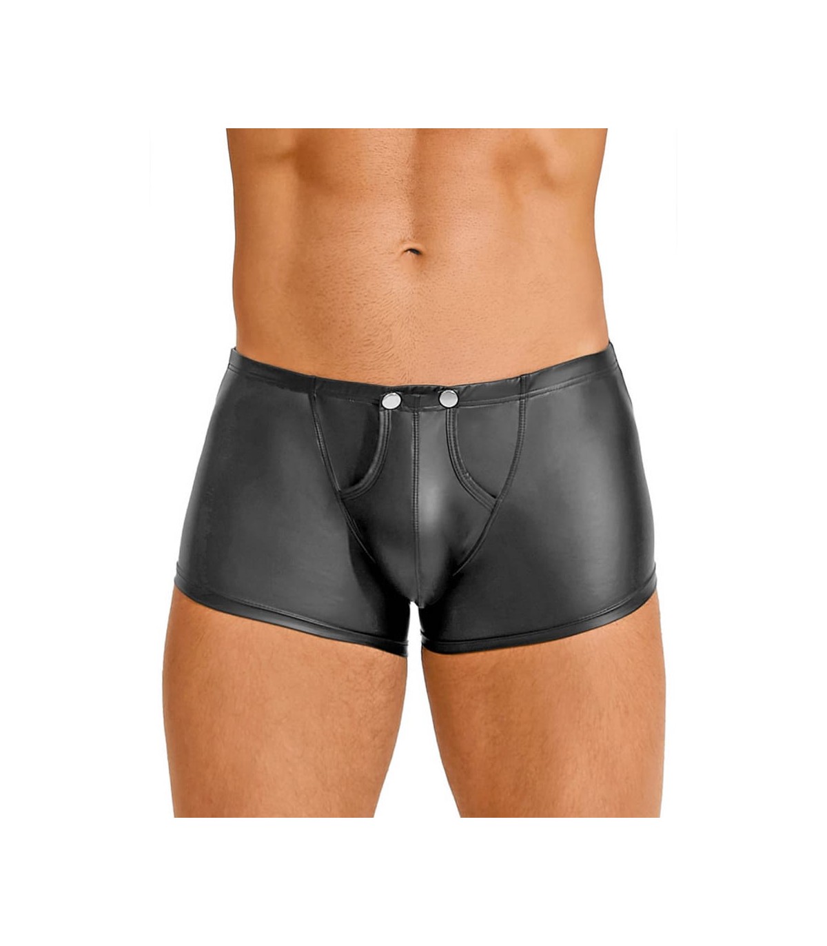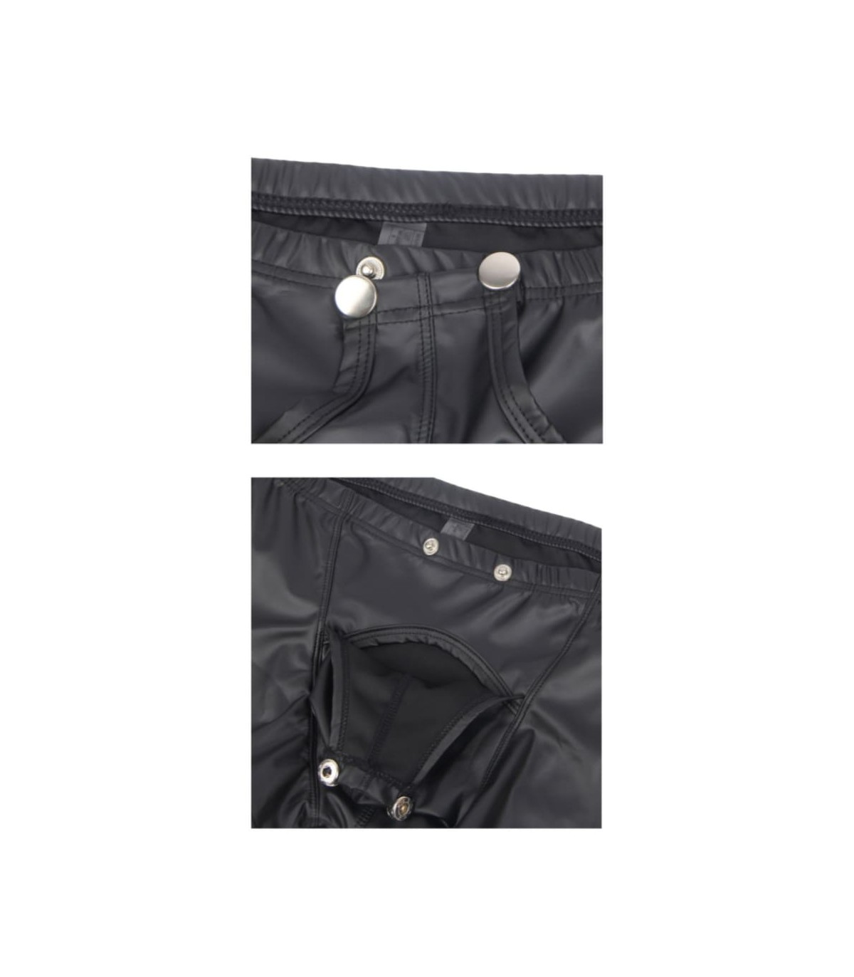 Boxer avec poche avant ouvrable pour dévoiler le sexe. Avec deux bouton-pression. Simili cuir noir effet brillant. Taille S/M et L/XL.