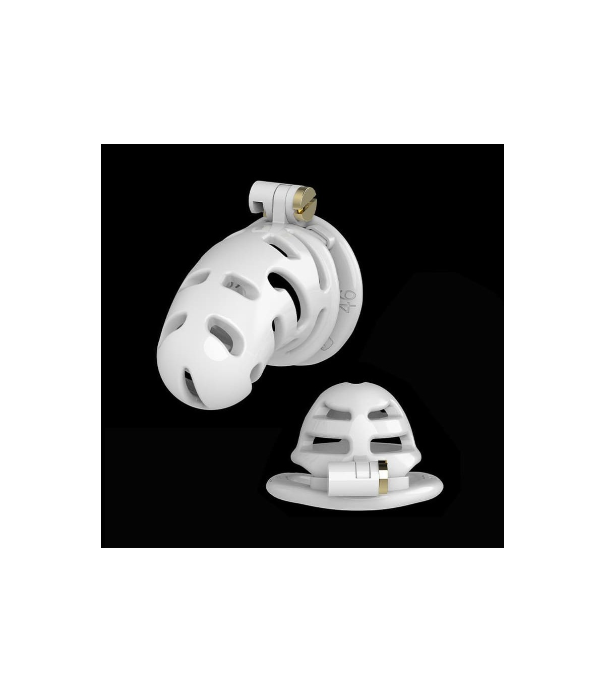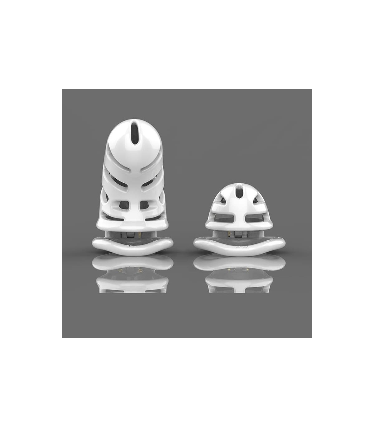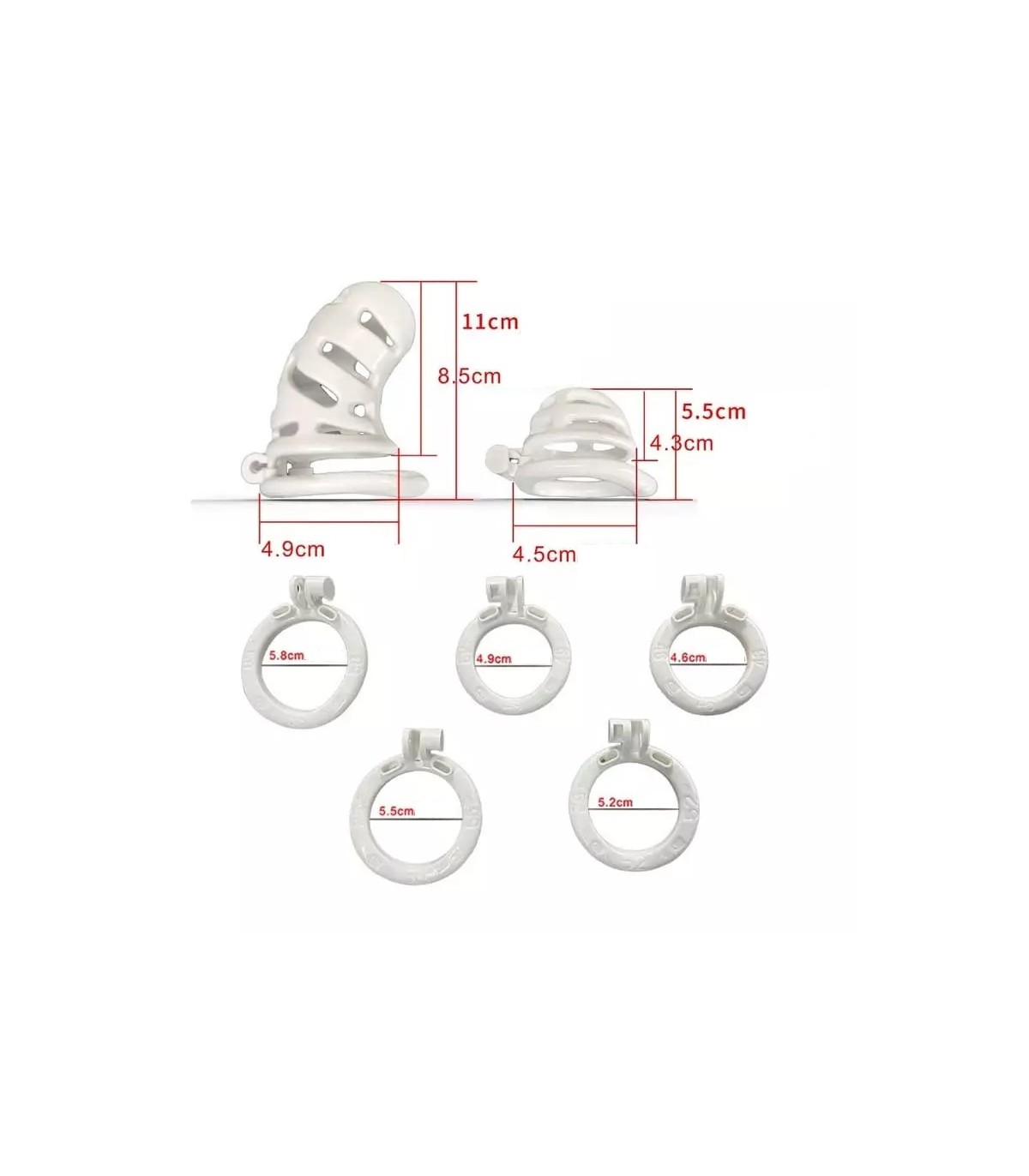 Cage de chasteté en plastique blanc. Proposée en 2 tailles : courte (5,5x4,5cm) ou longue (11x4,9cm). Livré avec 5 anneaux de 46 à 58mm.