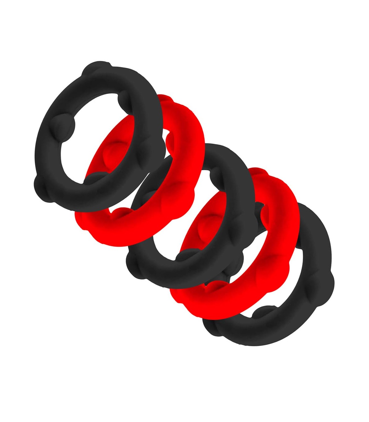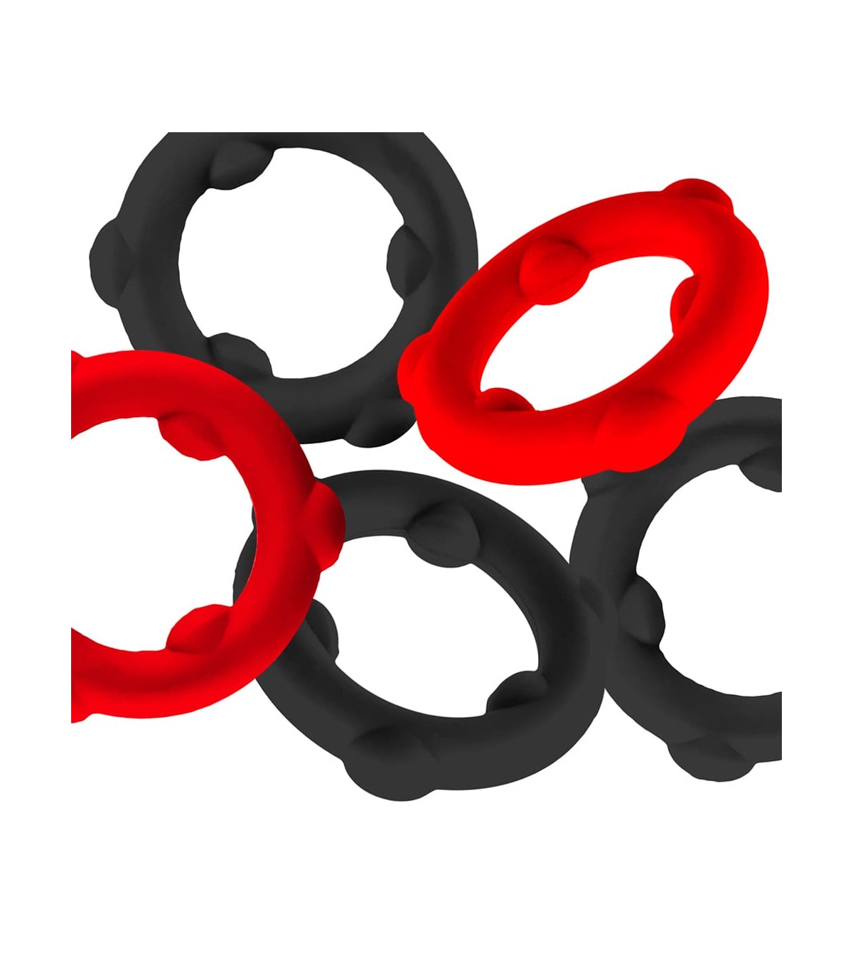 - Contenu du pack : 5 cockrings (3 noirs + 2 rouges)