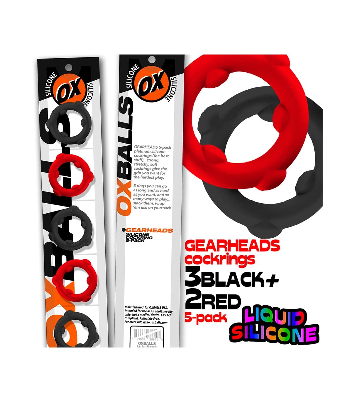 Prépare-toi à serrer, gonfler et briller avec le Lot de 5 Cockrings SPINNER GEARHEADS Rouge et Noir d’Oxballs. Diamètre intérieur : 25 mm. En silicone extensible.