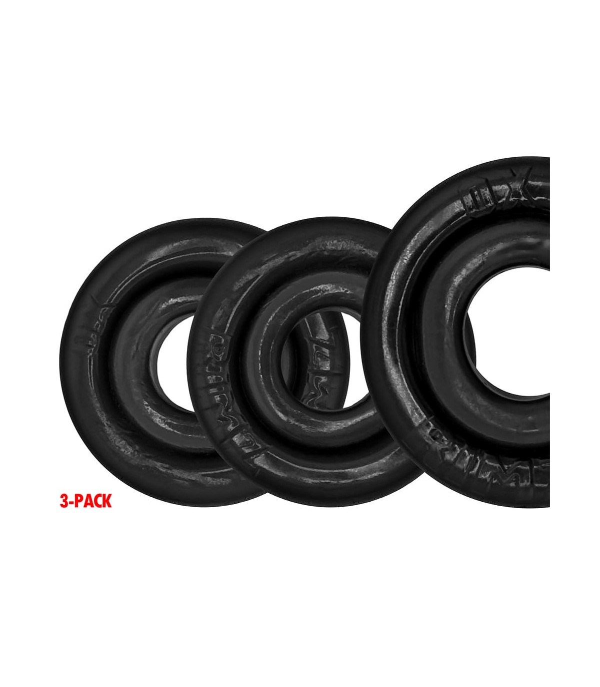 Lot de 3 anneaux en FlexTPR ultra extensible par Oxballs. 2 anneaux standard (Ø interne 19mm) + 1 anneau jumbo (Ø interne 20mm). Comme cockring ou ballstretcher.