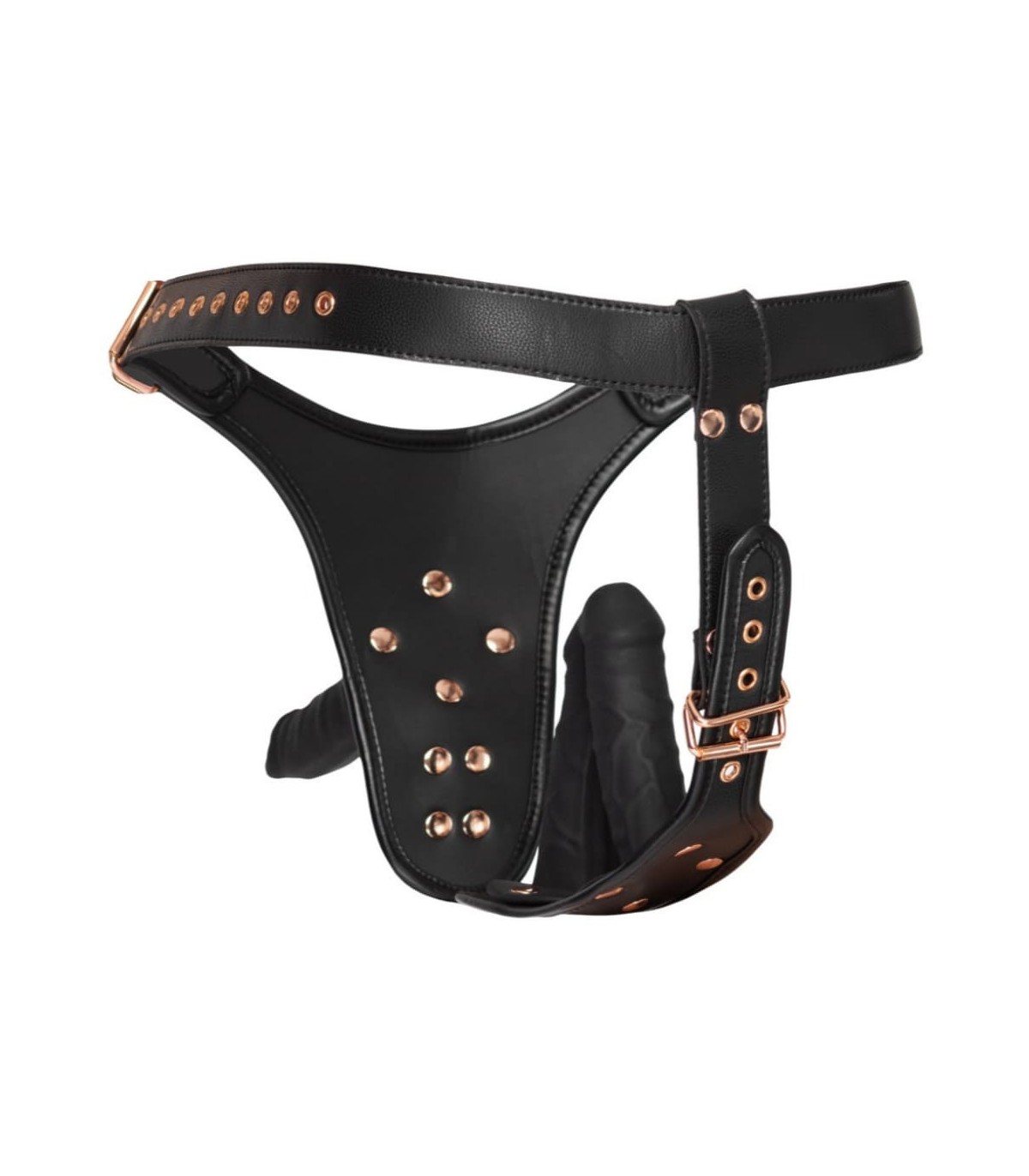Ce gode ceinture de Bad Kitty est un harnais ajustable en simili cuir noir avec 3 godes réalistes de différentes tailles, fixés de manière permanente à l'avant du string et à l'entrejambe. Les fermetures à boucle de chaque côté et à l'entrejambe permettent de régler le strap-on pour un ajustement parfait et ferme.