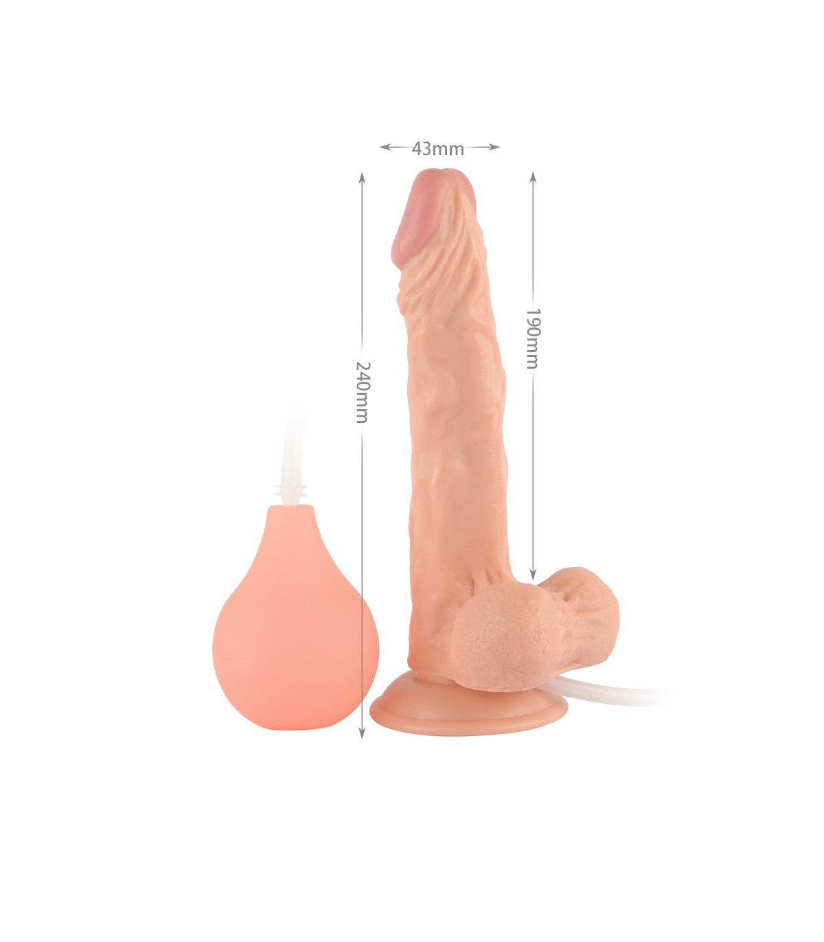 Gode réaliste avec fonction éjaculatoire. Largeur maxi de 4cm et longueur insérable de 16,5cm. Avec base ventouse et testicules. En silicone.