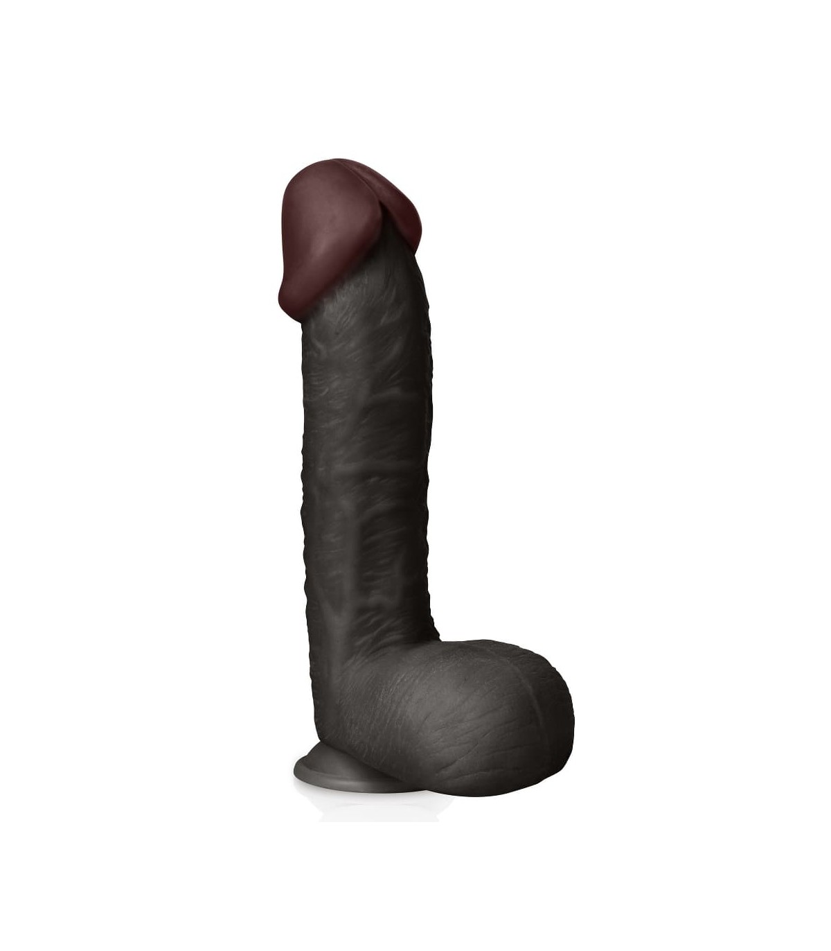 Gode réaliste avec ventouse. Largeur de 6,5cm au niveau du gland, 5,7cm ensuite. Longueur insérable de 23cm. En TPE noir.