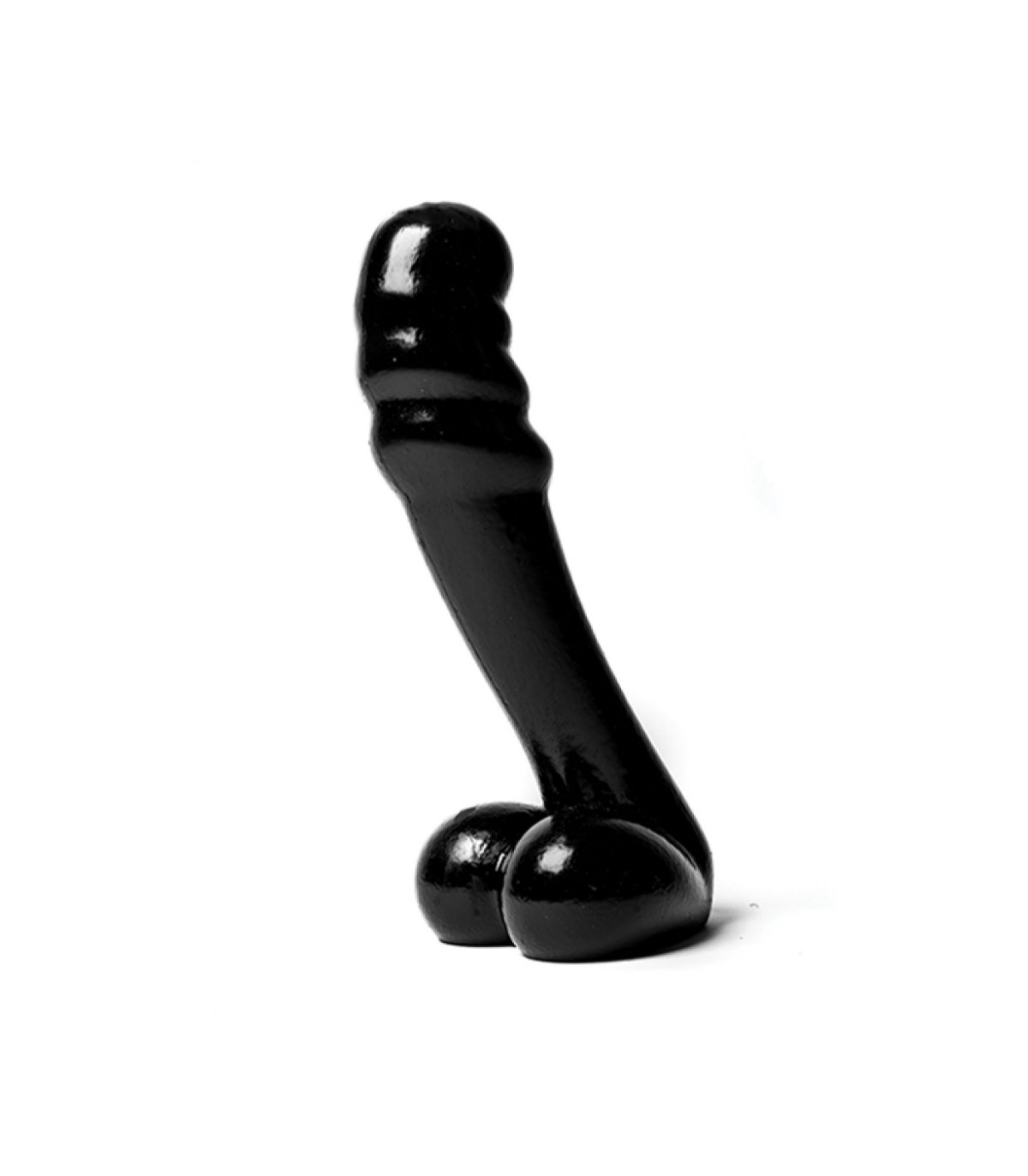 Gros gode noir avec forme recourbée et reliefs stimulants à l'extrémité. Largeur maximale de 7,5cm pour 25cm de longueur insérable. En PVC noir souple.