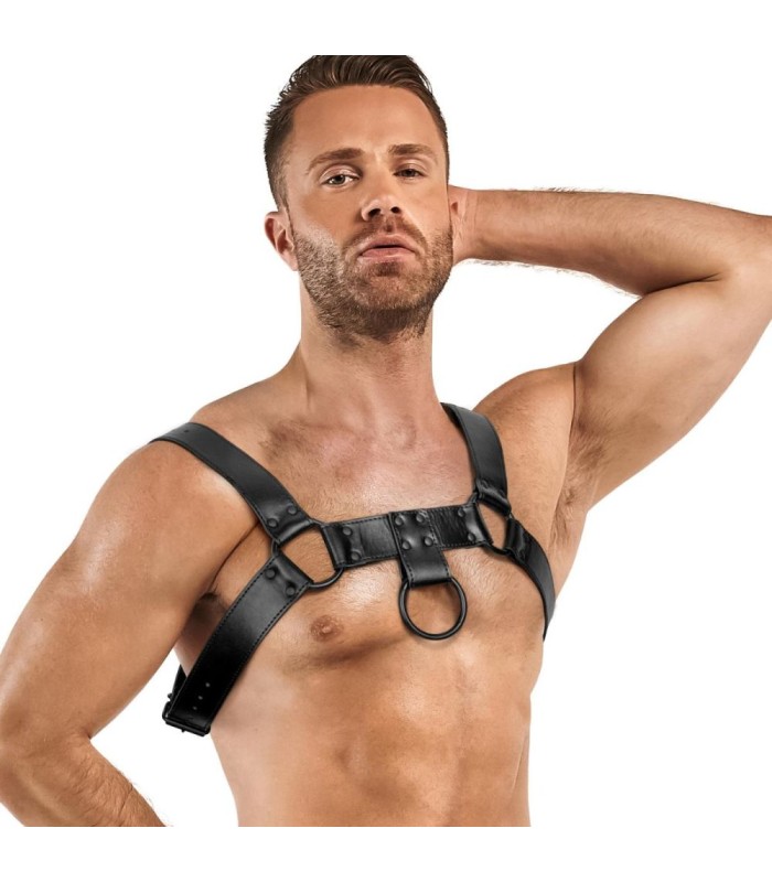 Ce Harnais BDSM Homme Bruno Noir de la marque Bedroom Fantasies est en simili cuir noir avec une forme en H. Il permet de mettre en valeur le buste mais est aussi un accessoire pour vos séances BDSM.