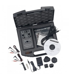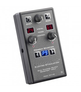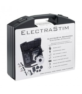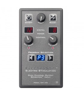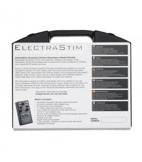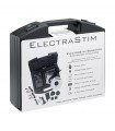 Boîtier de contrôle électro avec canal unique, 7 modes et 24 niveaux de stimulation. Kit comprenant électrodes adhésives, anneaux péniens et plug électro.