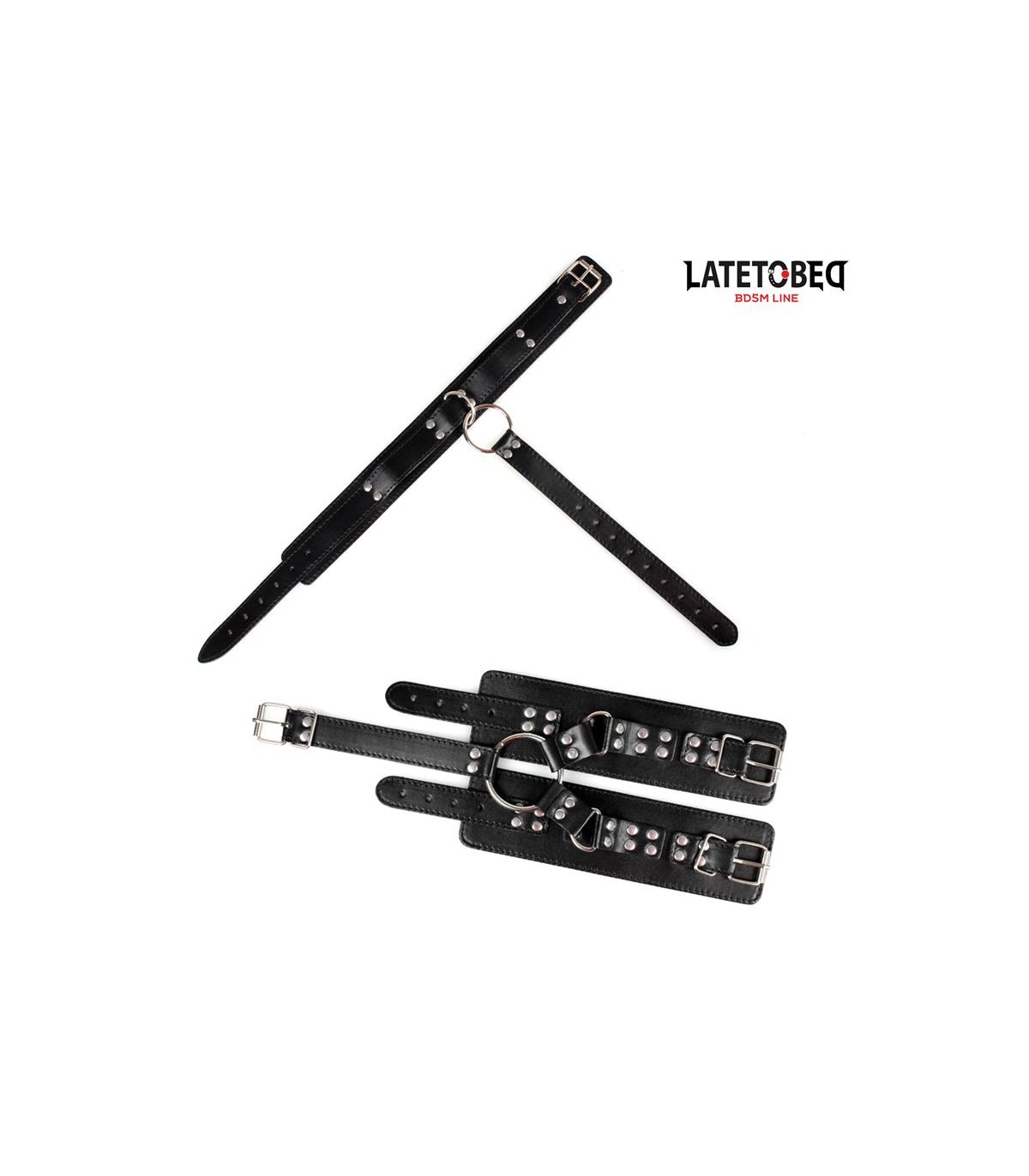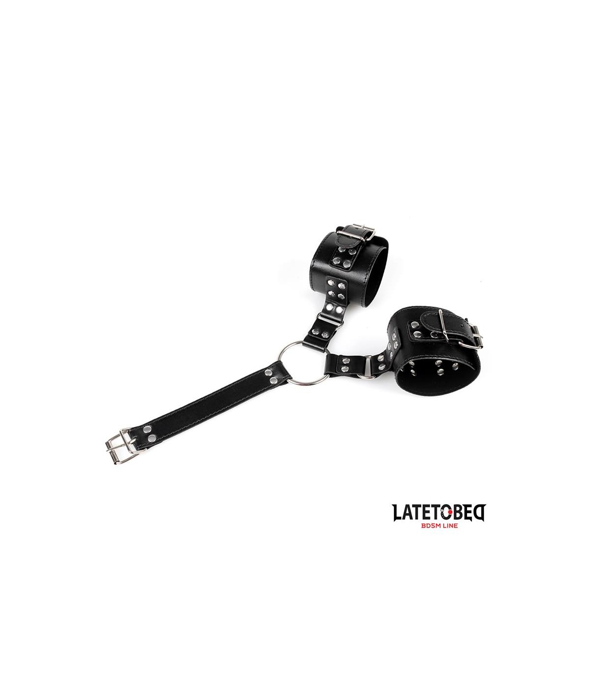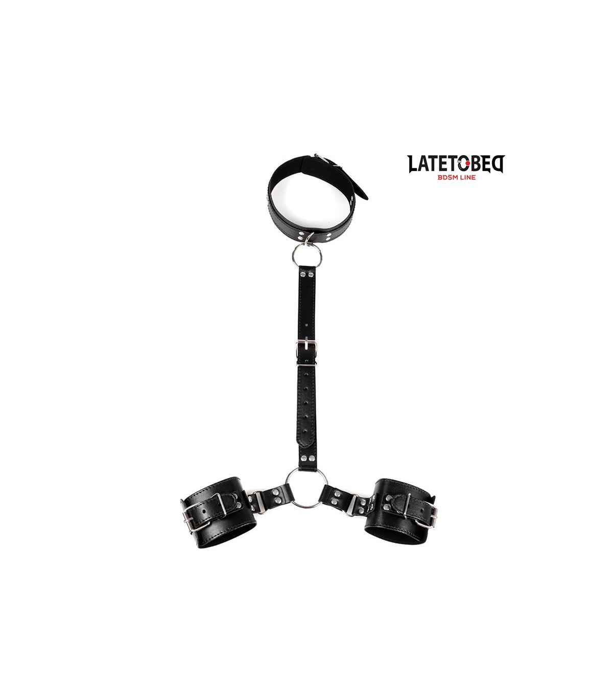 Accessoire BDSM pour attacher le soumis. Avec menottes et collier reliés et ajustables. En simili cuir noir et métal.